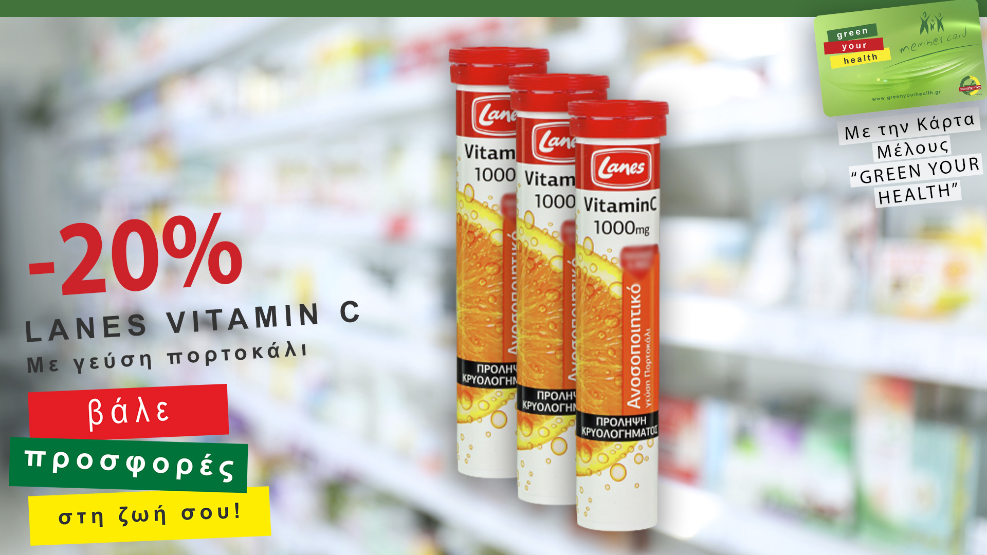 Προσφορά -20% με τη χρήση της Κάρτας Μέλους “Green Your Health” στις Lanes Vitamin C 1000mg με γεύση πορτοκάλι από 19 έως 31 Οκτωβρίου 2020 στα φαρμακεία του δικτύου Green Pharmacy Νότιας Πελοποννήσου. Συμπλήρωμα διατροφής για την αντιμετώπιση του κρυολογήματος, σε αναβράζουσα μορφή, για εύκολη λήψη με υπέροχη γεύση πορτοκάλι. Μείνετε συντονισμένοι. Περισσότερες εκπτώσεις θα […]