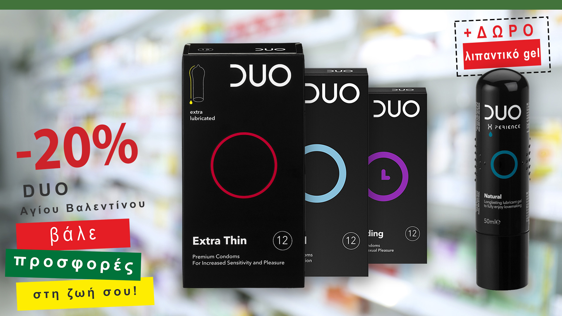 Προσφορά -20% επιλεγμένα προφυλακτικά DUO +ΔΩΡΟ λιπαντικό gel από 3 έως 23 Φεβρουαρίου 2020 στα φαρμακεία του δικτύου Green Pharmacy Νότιας Πελοποννήσου.