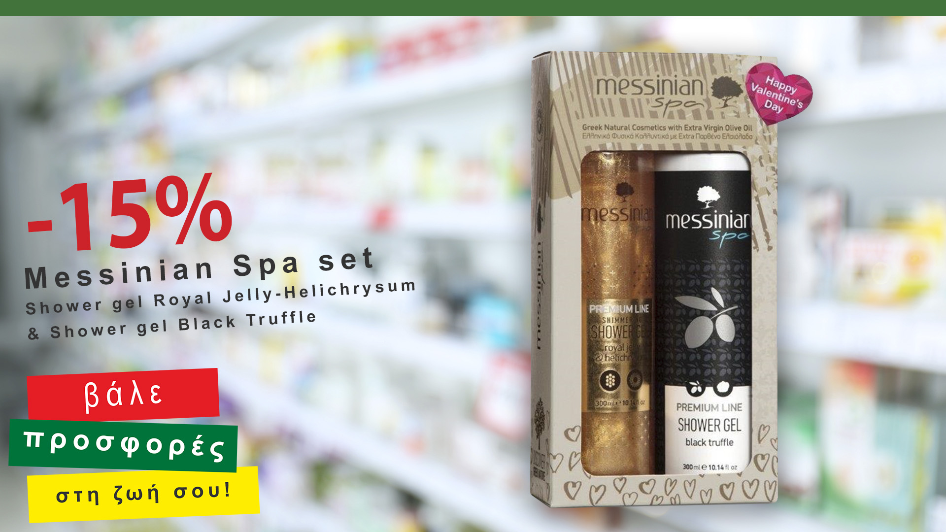 Προσφορά -15% στo σετ Messinian Spa (Shower gel Royal Jelly-Helichrysum 300 ml & Shower gel Black Truffle 300ml) από 3 έως 16 Φεβρουαρίου 2020 στα φαρμακεία του δικτύου Green Pharmacy Νότιας Πελοποννήσου.